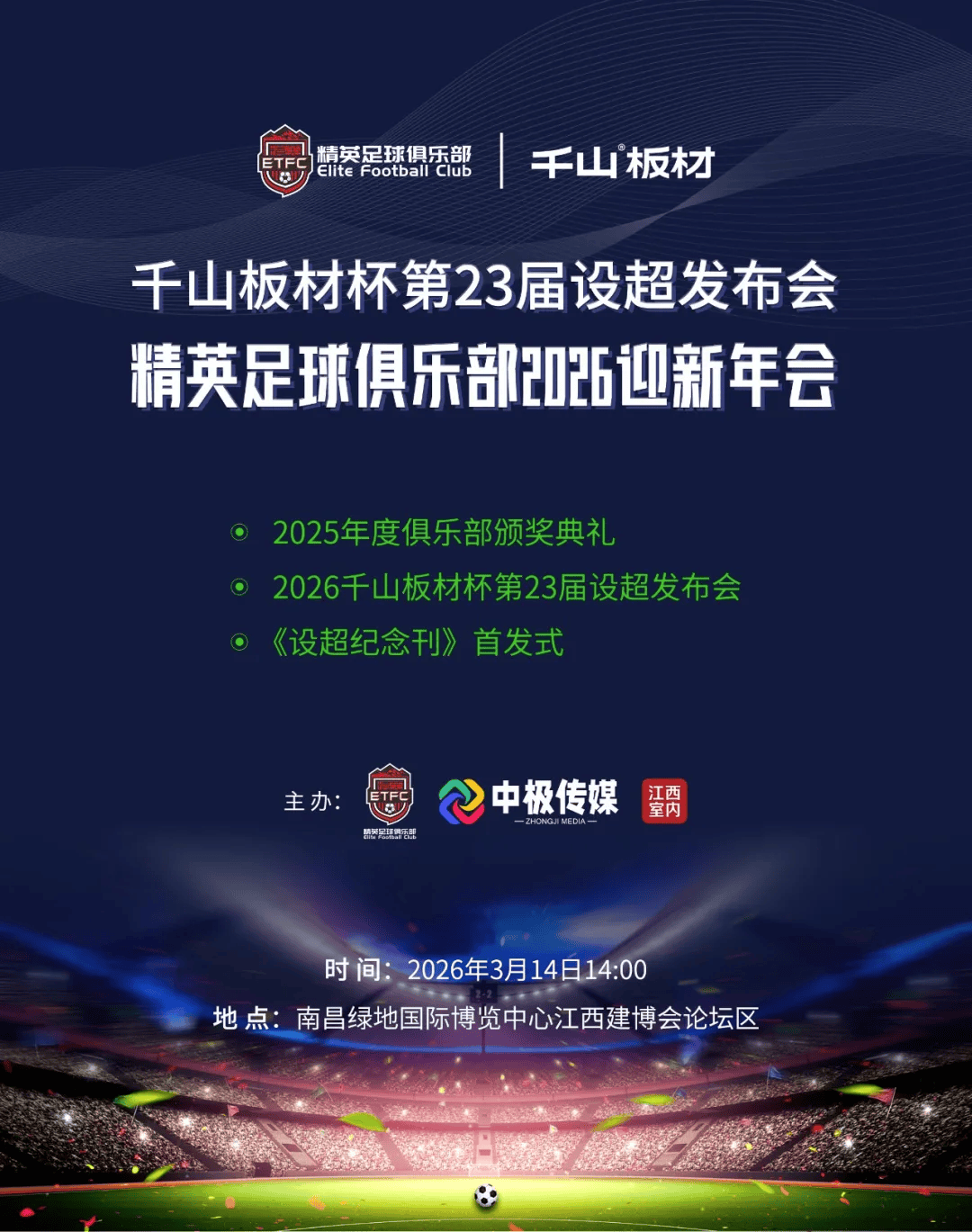 2026年3月14日下午13:30,由精英足球俱乐部、中极传媒、江西室内联合主办的“千山板材·精英足球俱乐部2026迎新年会暨2025年度颁奖盛典”将在九龙湖绿地国际博览中心江西建博会论坛区隆重举行,我们诚挚地邀请球员们共同参与一场属于绿茵、荣誉与情谊的盛会。这次迎新年会不仅是精英足球俱乐部走过的第11个年会。我们借助江西建博会之势,共同见证一届更正式、更富影响力的年会。江西设计师足球超级联赛以及江西设计师足球队在2025年表现优秀的球员和赞助商,我们将给予荣耀表彰,期待与您一同见证。
