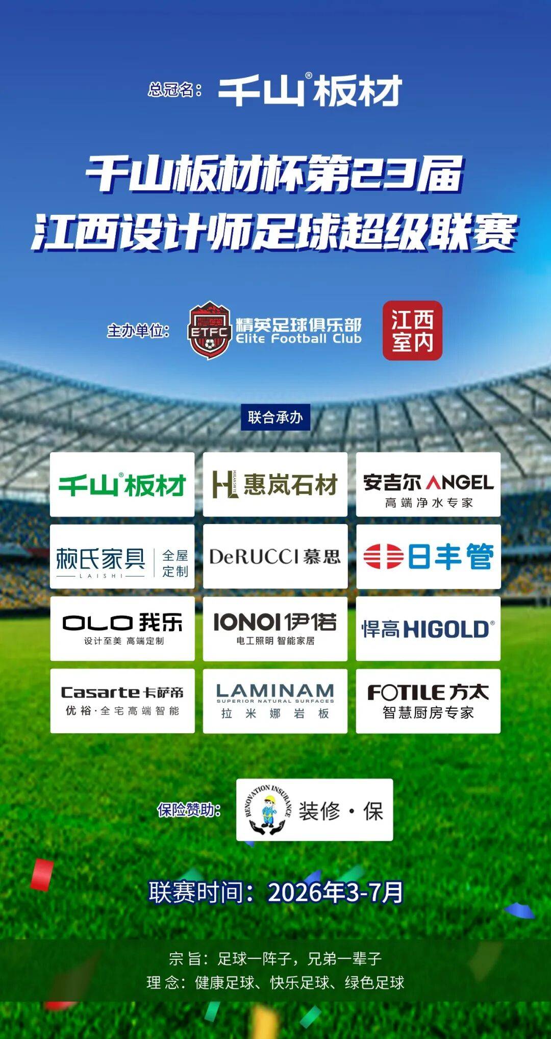 经过1个月的商谈、敲定,2026年春夏季举办的第23届江西设计师足球超级联赛正式确定了12战队的冠名和赞助品牌,总冠名是千山板材;11个赞助分冠名是惠岚石材、安吉尔净水、赖氏家具、慕思卡丽亚、日丰管、我乐全屋定制、伊诺智能开关等7个老赞助商品牌以及悍高五金、卡萨帝优裕智能、拉米娜岩板、方太智慧厨房等4个首次参赛的新晋品牌组成。千山板材杯第23届设超一触即发,期待和大家共同见证、共同挥洒,狂欢2026!3月14日精英足球俱乐部2026迎新年会上,我们将为12支战队品牌进行正式授牌!