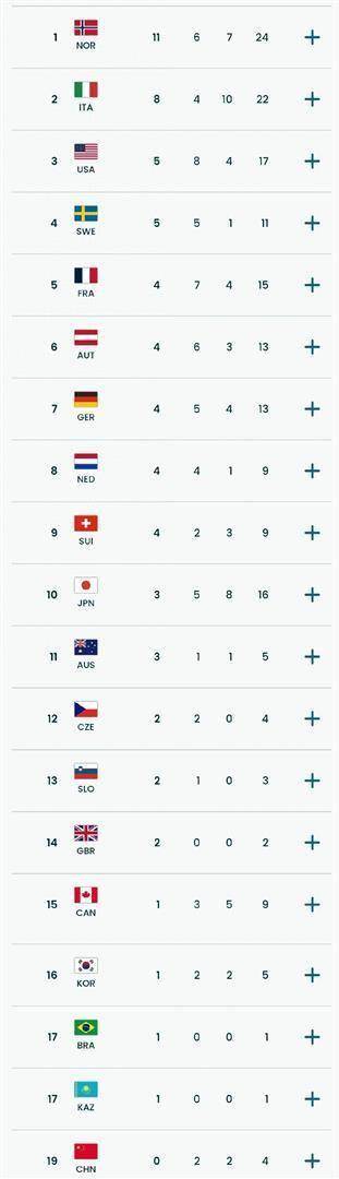 目光转向其他亚洲队伍。日本代表团是当前亚洲冰雪的领跑者,3金5银9铜共17枚奖牌的成绩,不仅让他们高居金牌榜第十,其总奖牌数甚至超过了排名靠前的许多欧洲队伍。韩国代表团目前仅获得1枚金牌、2枚银牌和2枚铜牌,排名金牌榜第16位,同样陷入了“金牌荒”的困境。 哈萨克斯坦代表团则收获1枚金牌,排名第18位。