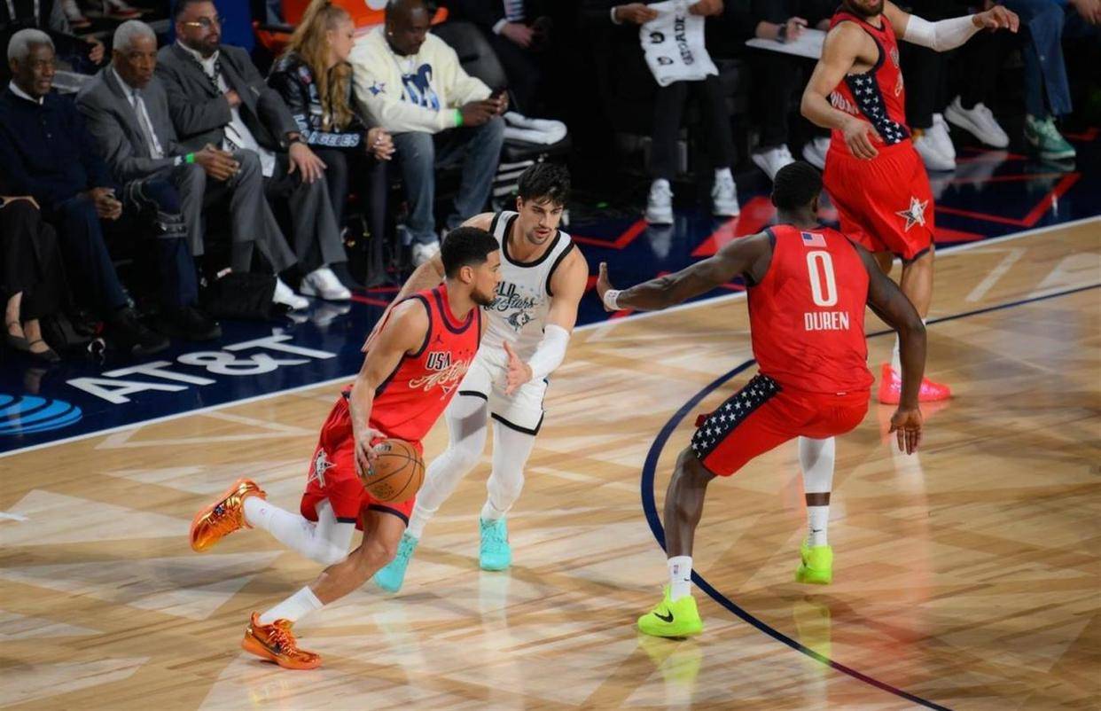 美国新星队的年轻人们迅速回应。 爱德华兹用三分和突破连续得分,活塞中锋杰伦·杜伦完成空接暴扣。 双方从一开始就展开了拉锯战,而不是互相礼让的扣篮表演。 比赛强度肉眼可见地提升,甚至出现了长时间的得分荒和连续的失误。